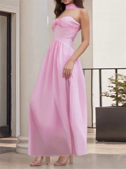 Women Party Long Dress Solid Color Tube Dress Summer Fashion Backless Casual Strapless Pleated Dress with Choker Scarf